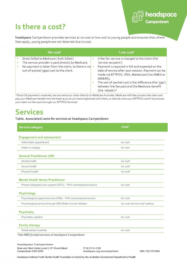 headspace Camperdown provides services at no cost or low cost to young people and ensures that where fees apply, young people are not deterred due to cost.